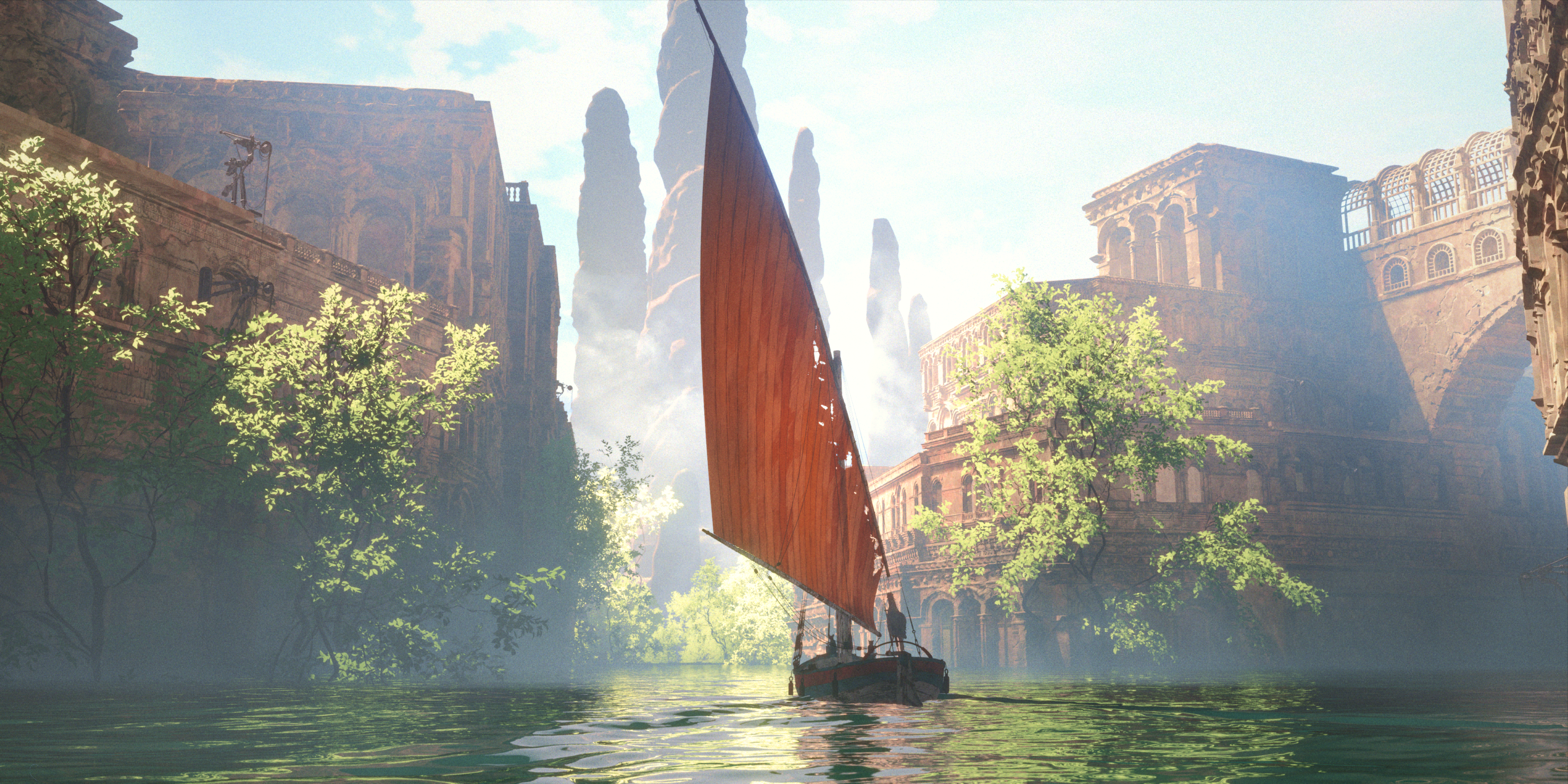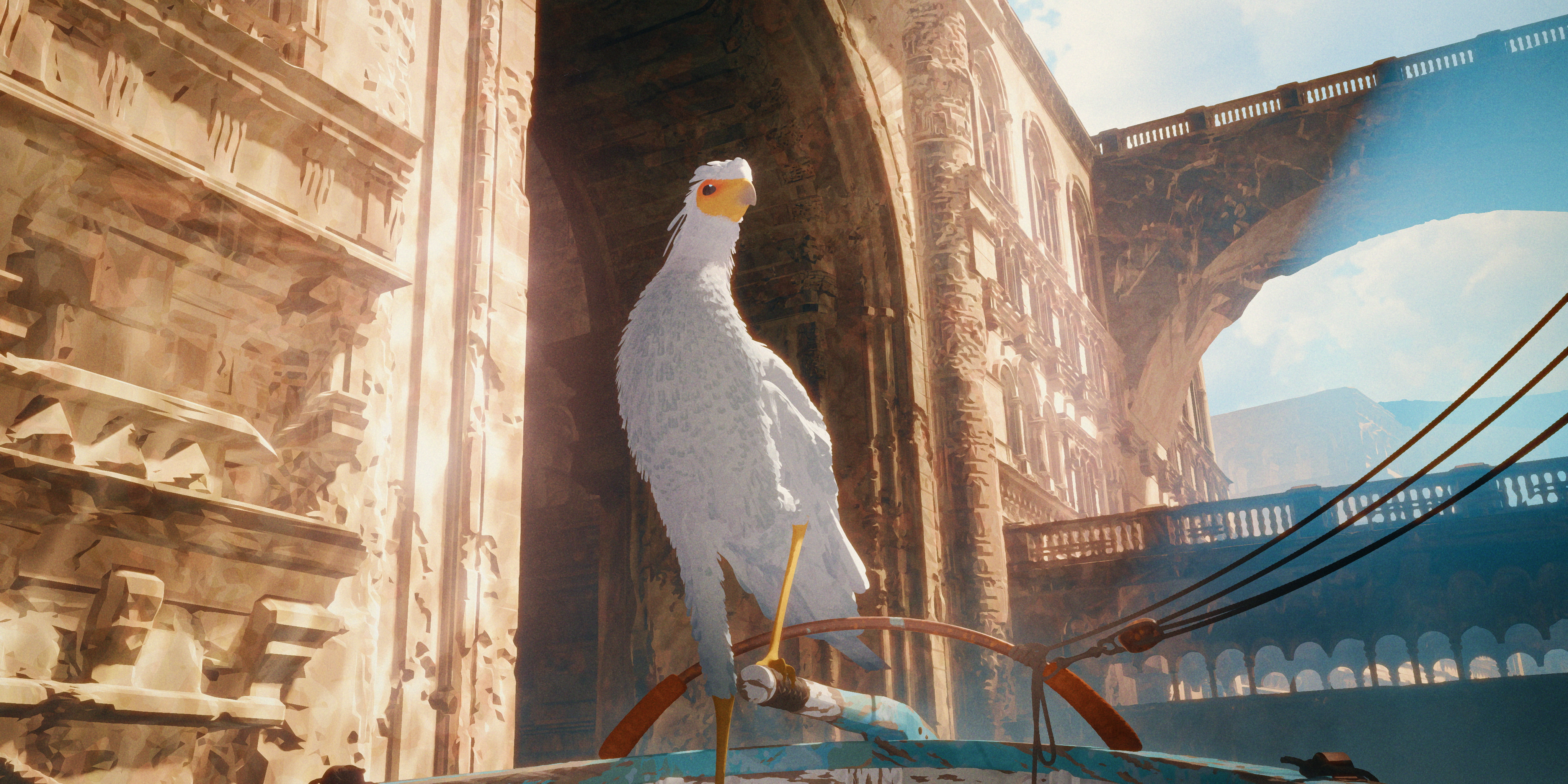 Świat przedstawiony w Flow żyje i oddycha – budynki, roślinność i woda mają niemal organiczną energię. W szczególności gra świateł i cieni sprawia, że każda scena jest prawdziwym dziełem sztuki. Oświetlenie zmienia się w zależności od atmosfery – od słonecznych, ciepłych tonów po mroczne i przytłaczające ujęcia w momencie zagrożenia. Widać, że twórcy z niezwykłą precyzją podeszli do kwestii wizualnej, dbając o najmniejsze detale, które wzbogacają immersję.